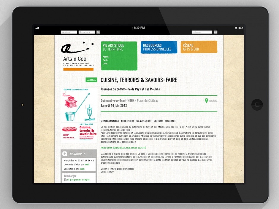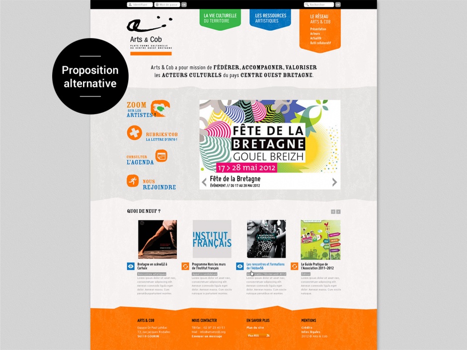 Refonte du site internet de l’association Arts & Cob, plateforme culturelle du centre ouest Bretagne. Travail collaboratif avec le Potager Graphique (Graphisme), Kat (CSS) et Toffer (Développement).